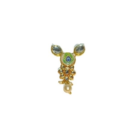 This elegant Kundan hasli pendant features a central peacock feather motif surrounded by two teardrop-shaped Kundan stones. The intricate gold-toned design is adorned with sparkling stones and finished with a delicate hanging pearl, adding a traditional and regal touch.