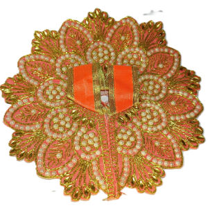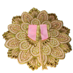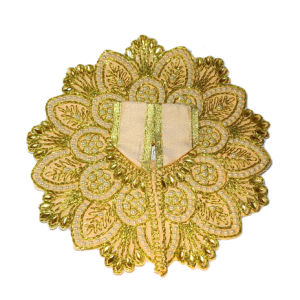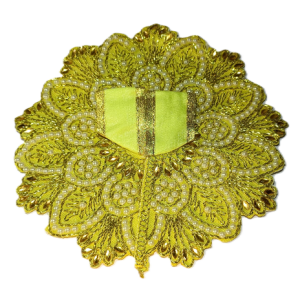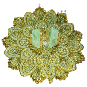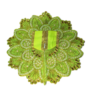 This is a beautiful Laddu Gopal poshak in sea green and gold, featuring intricate embroidery with shimmering golden threads and delicate white beadwork. The floral design radiates elegance, giving the deity an exquisite and divine appearance.