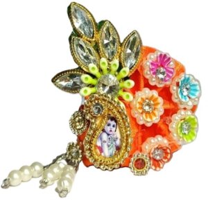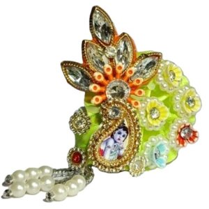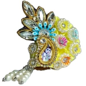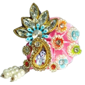 This is a vibrant and decorative pagdi designed for Laddu Gopal. It features a combination of pastel blue fabric, multicolored floral embellishments, sparkling stones, and pearl tassels. A central framed image of Lord Krishna adds a divine touch, making it a charming accessory for festive or daily adornment.