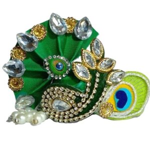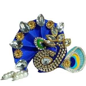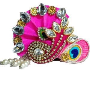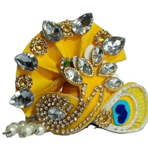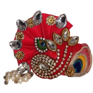 This is a striking orange pagdi for Laddu Gopal, adorned with sparkling white stones, golden accents, and intricate beadwork. It features a peacock feather motif and colorful embroidery, enhanced with a pearl tassel for added elegance—perfect for festive or ceremonial occasions.