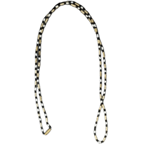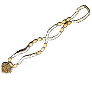 This is a traditional kanthi mala made with white beads and adorned with multiple tulsi leaf-shaped pendants, each featuring engraved religious symbols or script. It is commonly worn for spiritual and devotional purposes, especially in Vaishnav traditions.