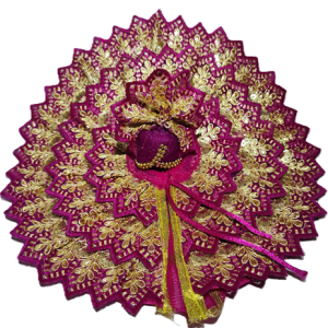 This is a beautiful Laddu Gopal dress set featuring a rich magenta base adorned with intricate golden embroidery. The outfit includes a matching pagdi (turban), embellished with shimmering floral designs, adding elegance and divine charm to the deity’s appearance.