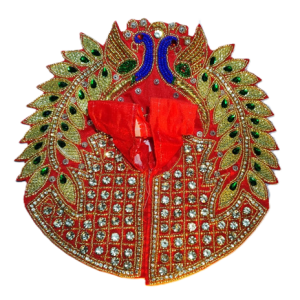 This stunning Laddu Gopal dress features a vibrant red base adorned with intricate zardosi embroidery and sparkling stone embellishments. The peacock-inspired design with golden leaves and colorful beadwork adds a regal touch, making it perfect for festive or special occasions.