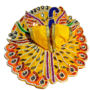 This vibrant Laddu Gopal dress features a striking peacock design with a rich yellow base. Decorated with multicolored zardosi embroidery, beadwork, and sequin accents, the poshak showcases a beautifully crafted peacock at the back with vivid blue, orange, green, and purple details. Perfect for festive occasions, this dress adds a divine charm and royal elegance to your Laddu Gopal idol.